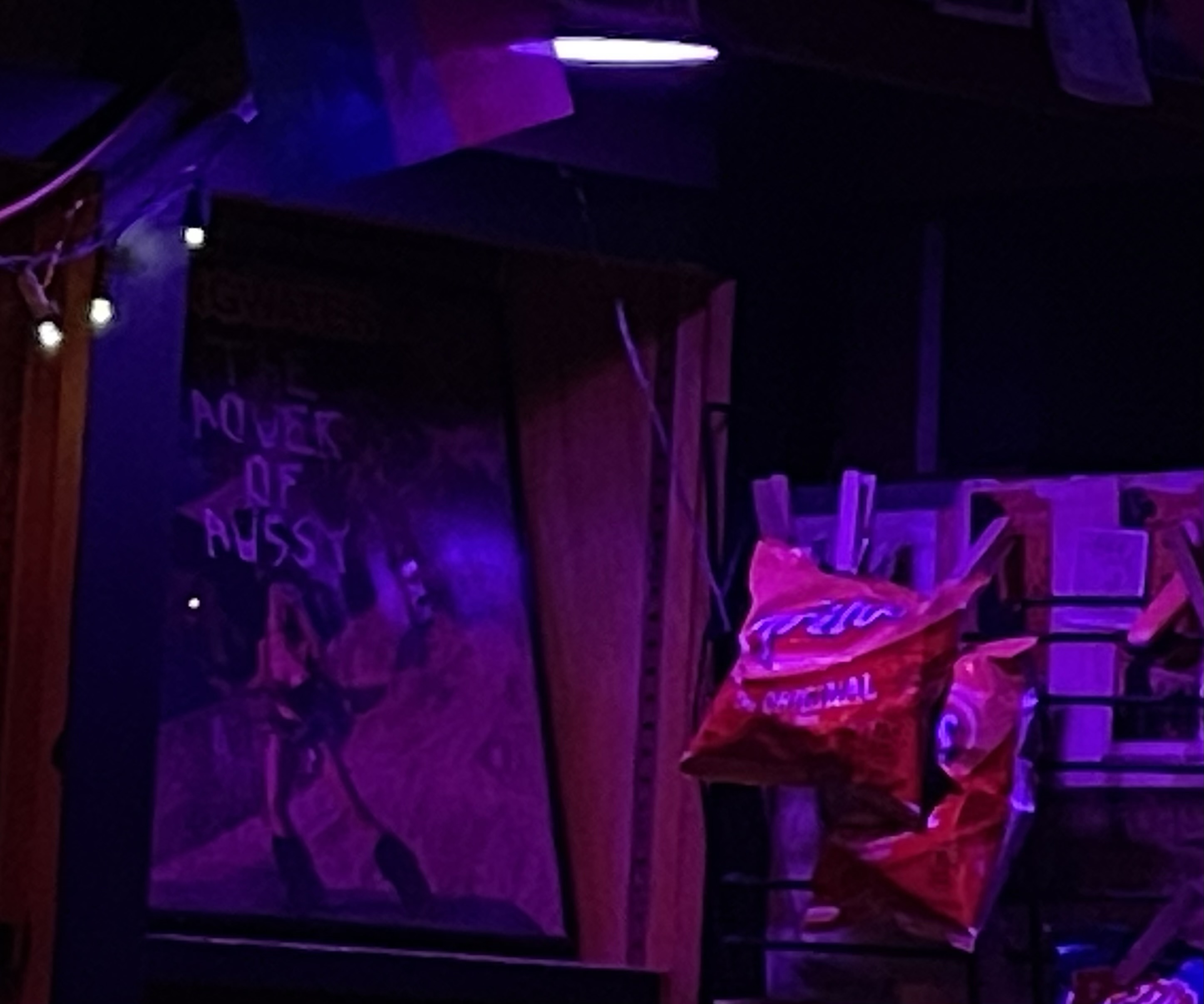 As for me, I chose a sign that was crookedly lettered “Pussy Is Power.” It sat in a pool of purple lamplight beside a rack filled exclusively with Fritos snack bags.