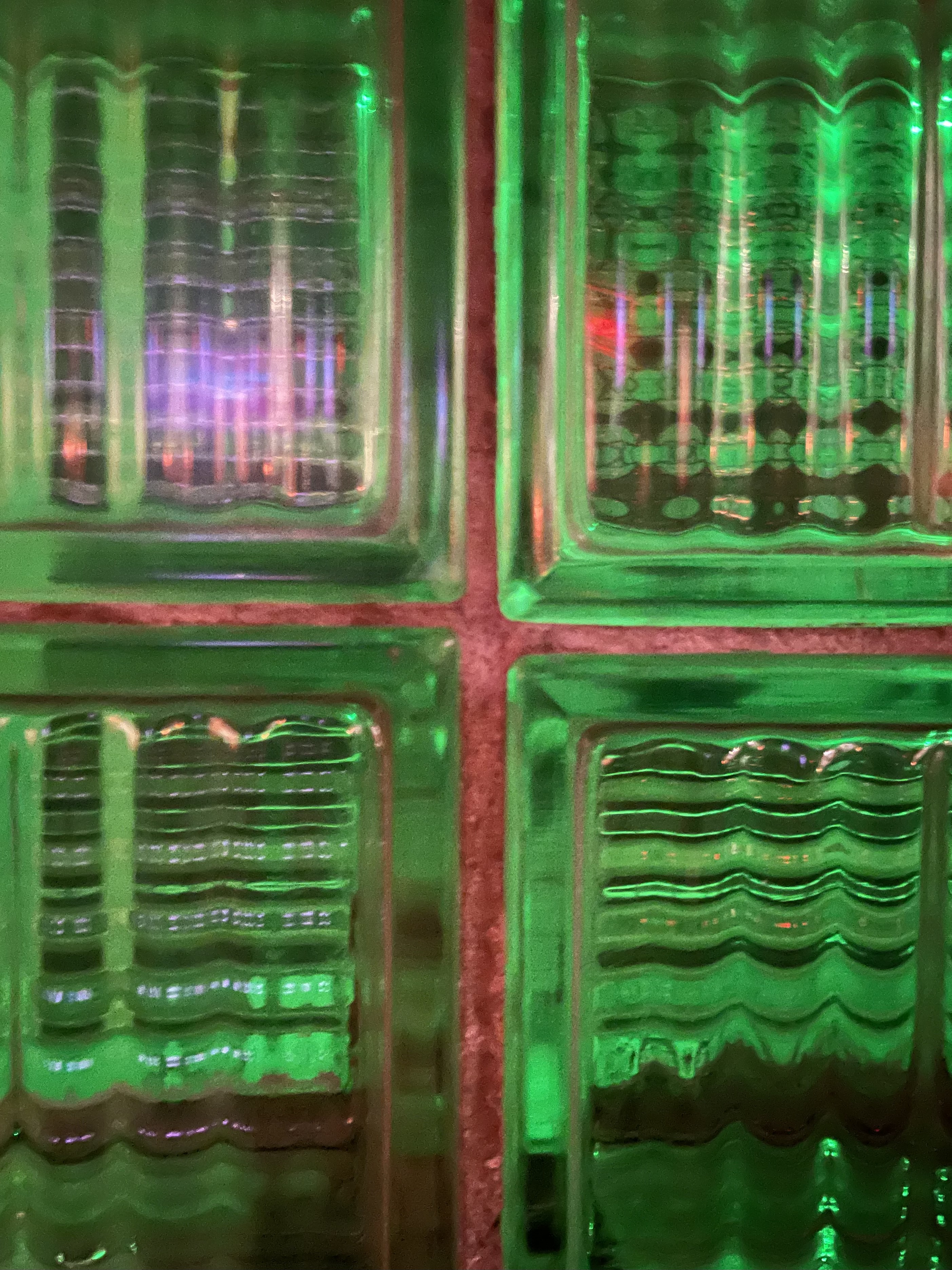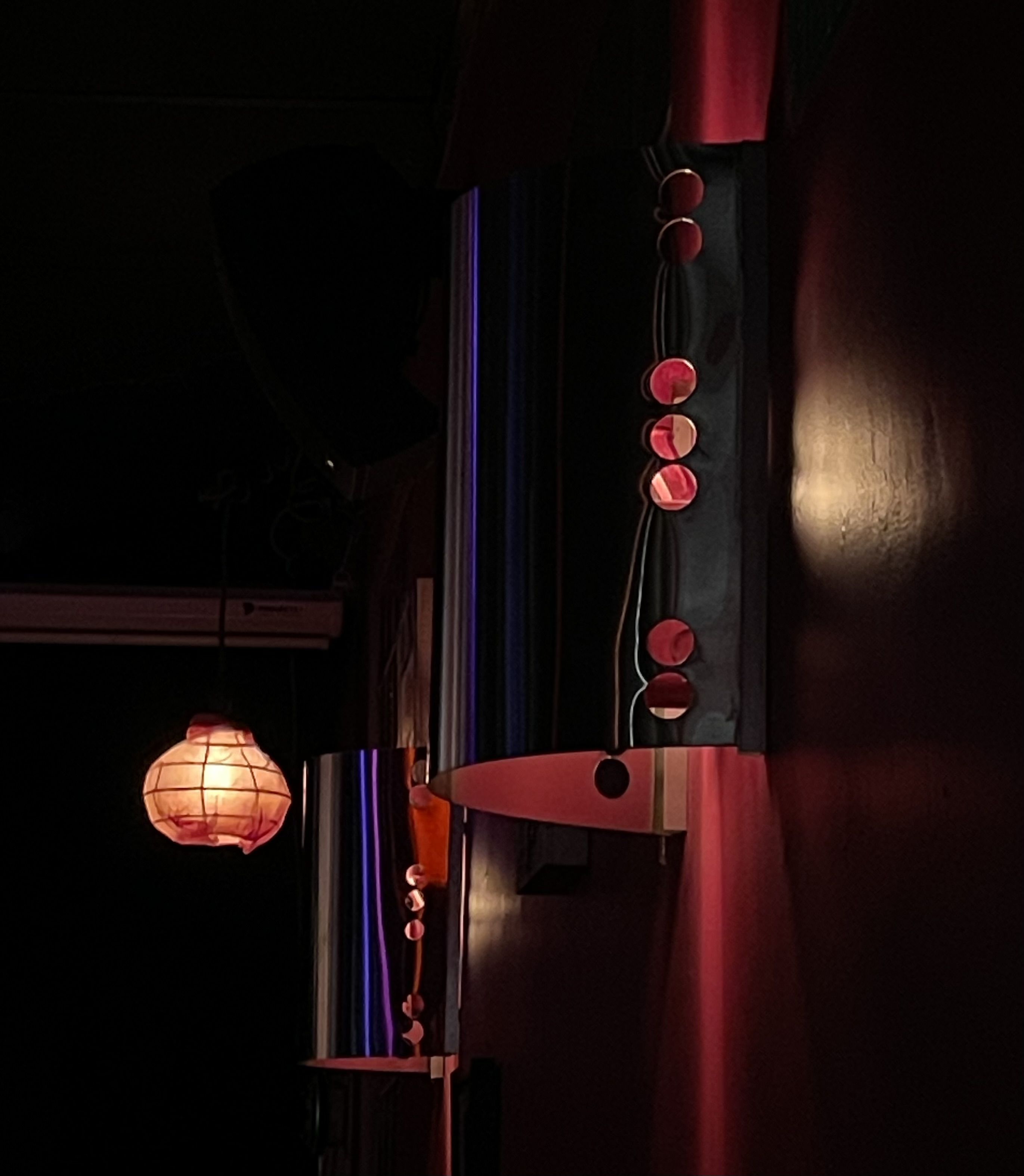 He was quiet for a minute as he scanned the contents of the back bar, every inch of which was riddled with paper clippings, caricatures, grade school block letters, and a bunch of other aesthetic junk. Eventually he settled on the rack of downturned glasses, which refracted the multi-colored cave lights in every direction. I loved that the frame he chose was something ordinary; there are always glasses behind a bar. However, most people only see glasses, they don’t notice the spectacle of reflections, and they definitely don’t consider them art.